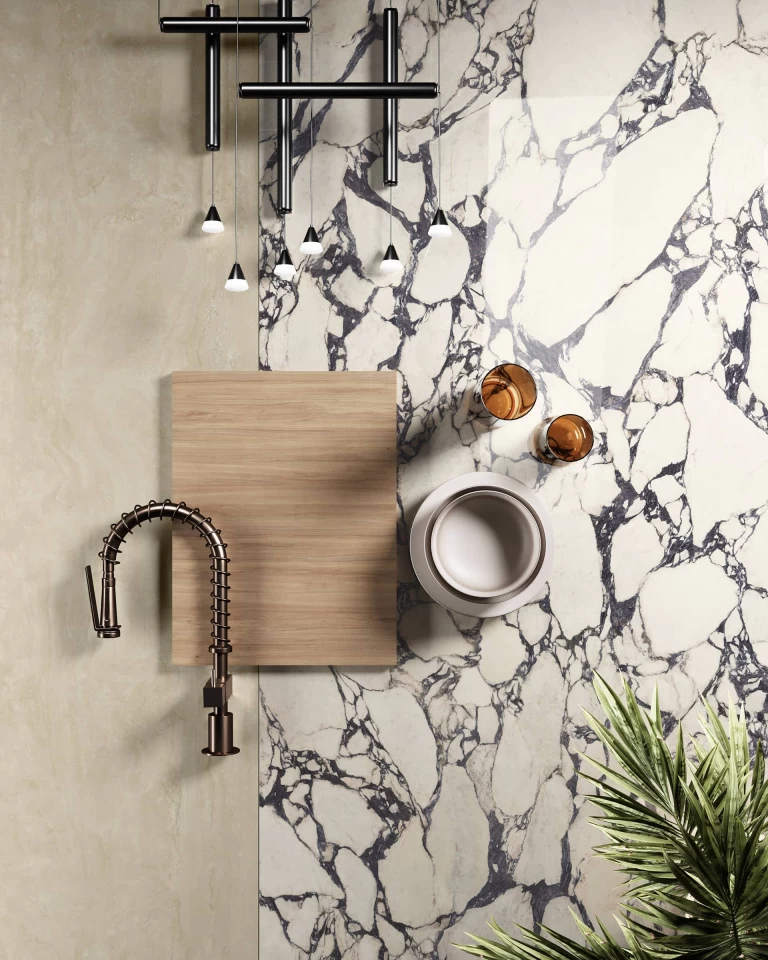 Format płyty: 320 x 160 cm – wielki format to podstawa luksusowych aranżacji. Dzięki niemu możliwe jest tworzenie imponujących, bezfugowych powierzchni, które wyglądają jak wycięte z jednego bloku marmuru.